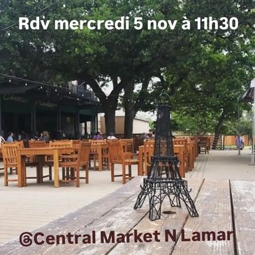 Les premiers mercredis du mois à 11h30 sur la terrasse de Central Market North Lamar. Repérez la Tour Eiffel sur la table.